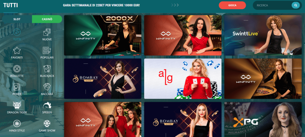 Nei 22bet casinò online, trovi una vasta gamma di giochi che spaziano dal brivido delle slot machine all’abilità strategica del blackjack, dalla fortuna della roulette all’emozione del poker, offrendo un mondo di divertimento e opportunità di vincita.
