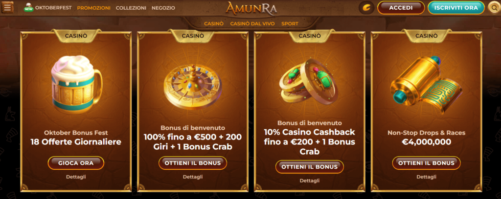 L’offerta di AmunRa casino è parecchio ricca ed offre molteplici possibilità di gioco per soddisfare le esigenze di qualsiasi giocatore. Se foste alla ricerca di un casinò sicuro, ricco di giochi, bonus e generosi premi allora AmunRa potrebbe fare al caso vostro.