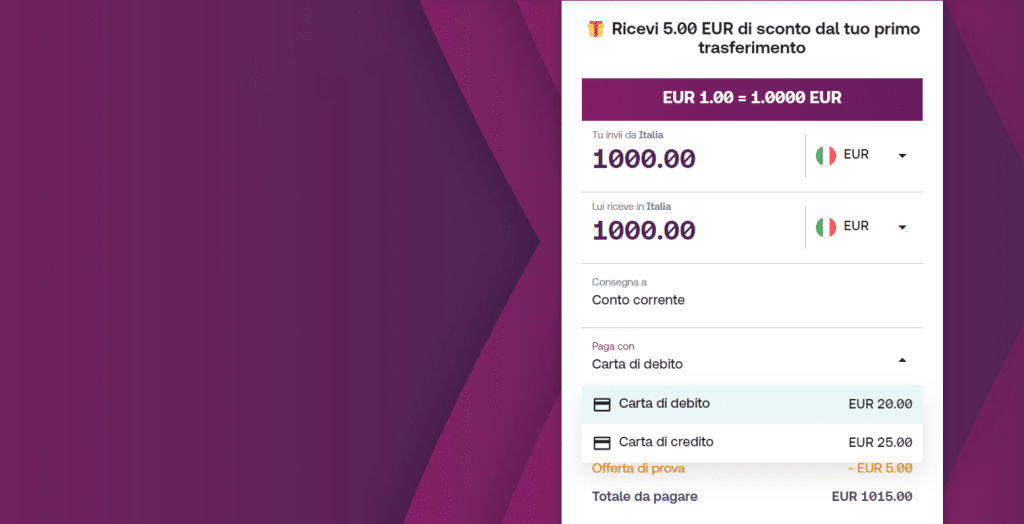 Carta di credito/debito €10 – €5.000 €20 – illimitato 24-72h Possibili commissioni