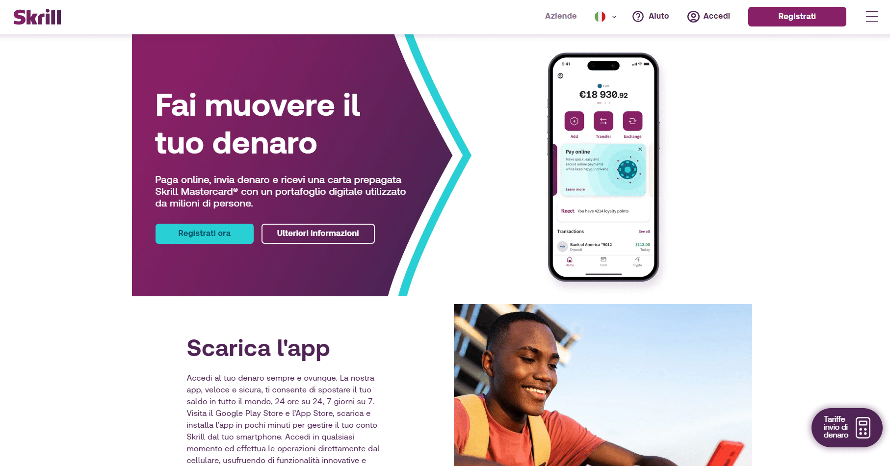 Servizi Invio e ricezione di denaro internazionale, pagamenti online e in-app, prelievo di contanti da ATM, carta prepagata Skrill Wallet