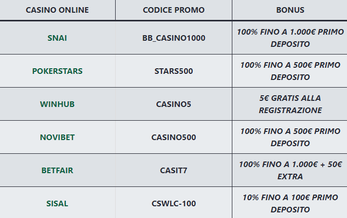 Come già accennato in precedenza, esiste una vasta gamma di codici bonus per i casinò online che andremo ad approfondire ulteriormente. Naturalmente, bisogna anche considerare quelle che sono le esigenze personali e che quindi la definizione di miglior codice bonus casinò potrebbe risultare alquanto soggettiva.