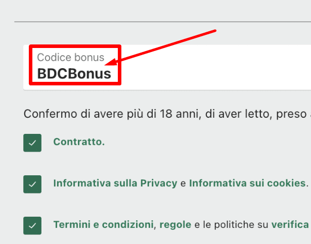 • Inserimento del codice: durante il processo di registrazione o all’interno del tuo account, ci sarà un campo apposito per inserire il codice bonus. Potrebbe essere denominato “Codice bonus”, “Codice promozionale” o qualcosa di simile.