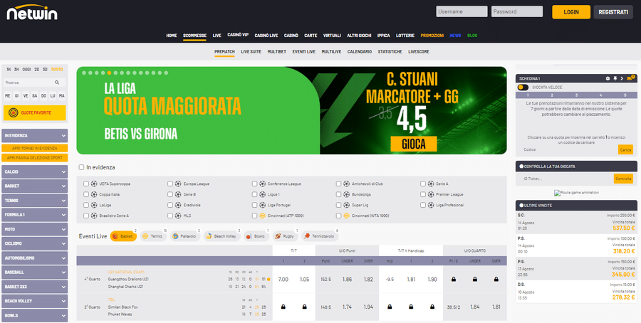 Anche analizzando le opzioni di scommessa abbiamo trovato tutto ciò che un better italiano può desiderare. Su Netwin potrai scommettere in modalità pre-match oppure live, sfruttando tante funzionalità utili a vivere a pieno la tua sessione. Nella schermata live è infatti presente anche la visualizzazione in streaming del match, per seguirne tutti gli sviluppi dall’interno della piattaforma.