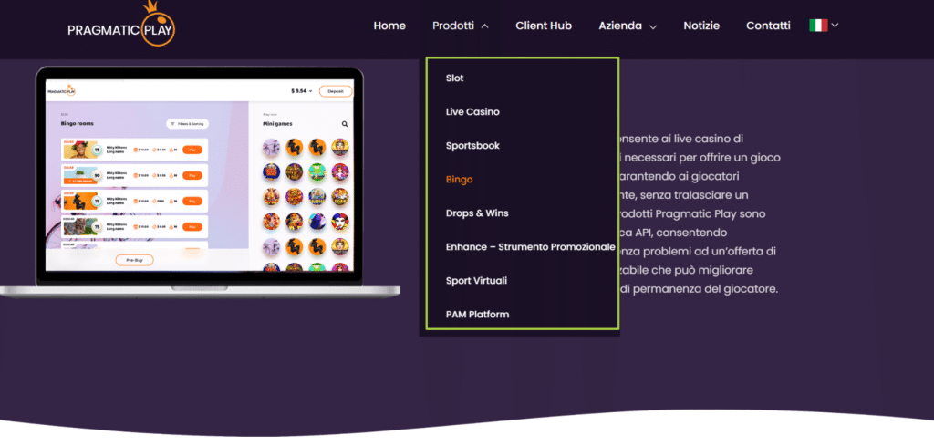 Pragmatic Play propone la quasi totalità dei giochi che si possono trovare in un casinò fisico, a partire dalle classiche slot machine, passando per i Virtual Sport, il Bingo e a tutti i casinò live. Qualsiasi sia il tuo interesse troverai sicuramente su Pragmatic Play il gioco che fa per te insieme a moltissimi altri giocatori. L’offerta è molto ampia, la cosa più pratica è sicuramente andare a provare direttamente l’ampia offerta di prodotti per trovare i giochi più adatti al proprio gusto e poter sperimentare nuove opportunità di gioco.